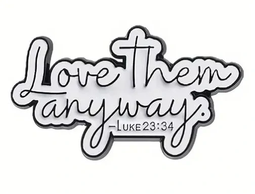 Křesťanská brož ( smaltovaný odznak ) s biblickým textem v angličtině Lukáš 23:34