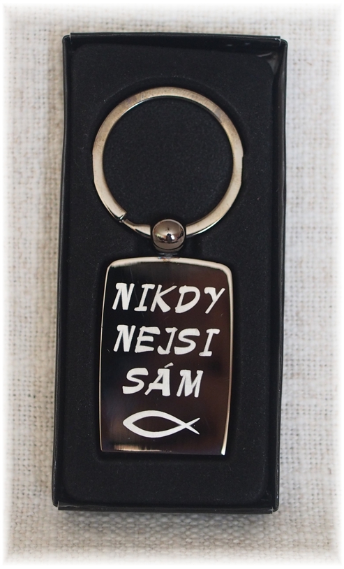 Nerezová klíčenka s karbonovým vzorem a nápisem Nikdy nejsi sám v dárkové krabičce.