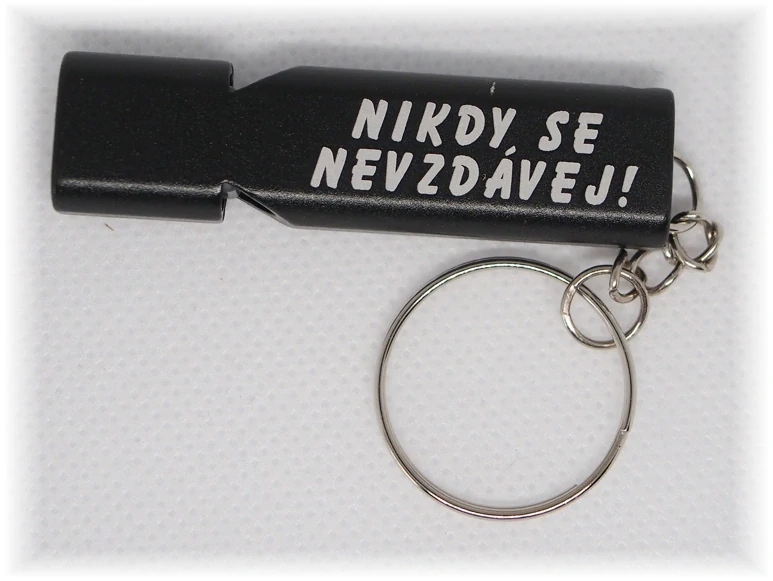 Klíčenka píšťalka dvojitá s gravírovaným textem Nikdy se nevzdávej!