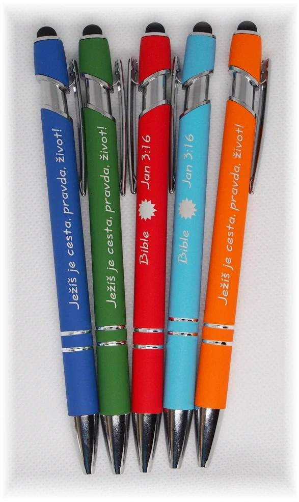 Kovové pero se stylusem - nápis z jedné strany: Ježíš je cesta, pravda, život! z druhé strany: Bible Jan 3:16