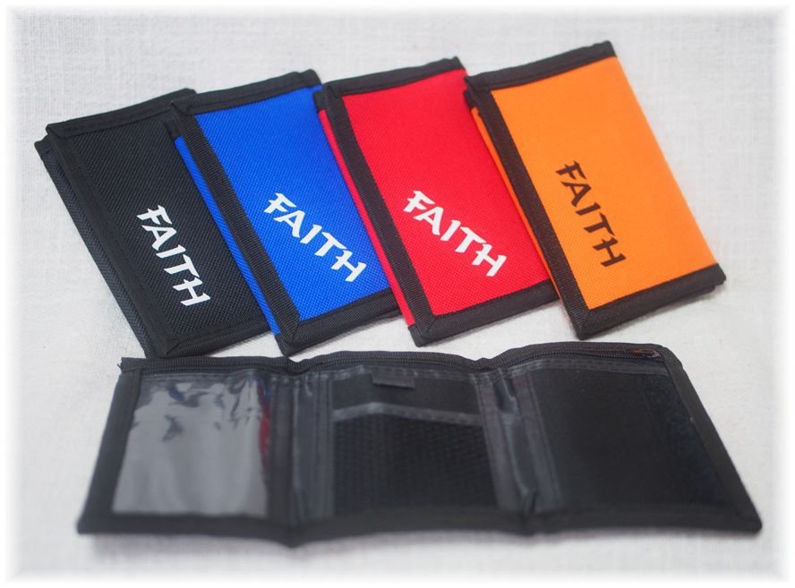 Peněženka s vnitřními kapsami a zapínáním na suchý zip. 300D polyester. Potisk: Faith (víra).